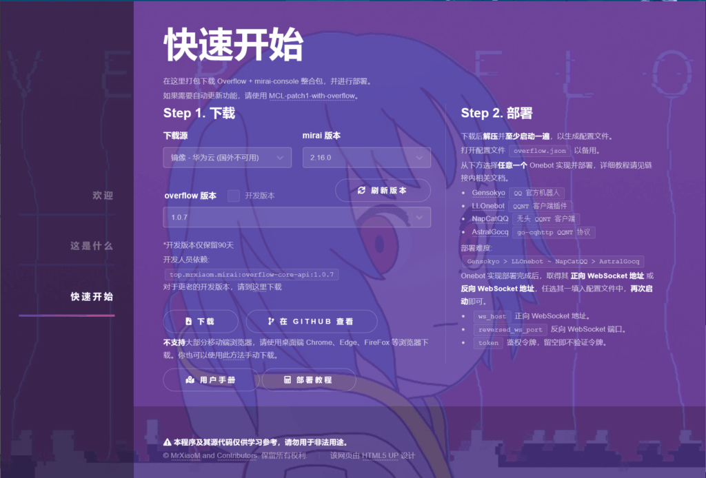 而mirai本身并不支持onebot、就像koishi一开始一样,所以我们需要安装overflow——它是一个令mirai也能加入onebot大家族的核心,而且overflow提供了整合mirai本体的版本,所以我们只需要下载一个overflow就可以了!