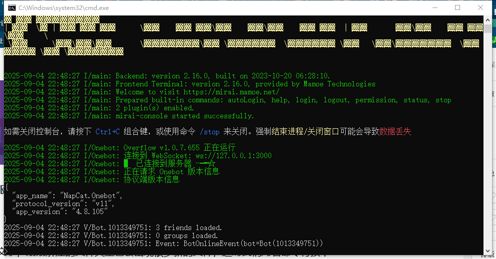然后Ctrl+S保存并退出,再次打开start.bat文件,此时mirai开始自动连接服务端