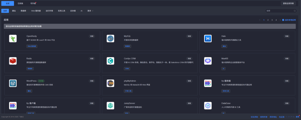 我们打开1Panel面板,打开应用商店,这里有许多现成的Docker应用,可以动动手指就能轻松安装到服务器上