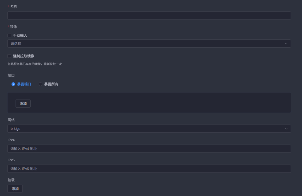 网络我们选择bridge,让所有容器能够共享网络;IPv4地址不用填,会自动分配地址,IPv6地址这里先不考虑;挂载的意思是,当容器运行的时候,将宿主机上某个文件夹和容器中某个文件夹绑定,这个也是需要根据不同服务考虑的。