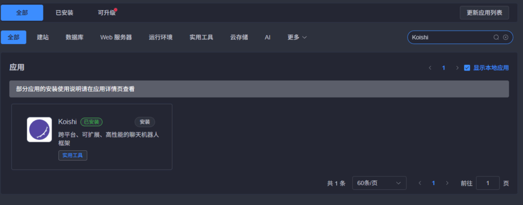 接下来我们面临两种选择!如果只需要使用内置插件与插件市场内的插件或完全不需要进行服务器远程插件开发(即本地开发完后再上传),可以查看直接通过1Panel市场安装;如果需要在服务器上进行开发(笔者的选择),则需要查看手动构建Koishi模板项目镜像(并不复杂!)但是,无论选择哪个方案,都需要查看将Koishi安全地暴露至公网