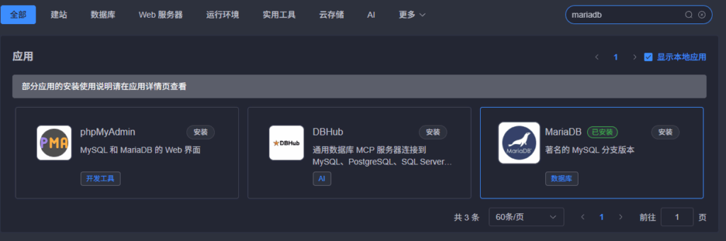 我们进入1Panel面板,点击应用商店,搜索MariaDB,点击安装: