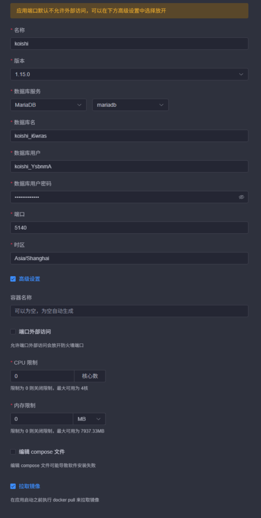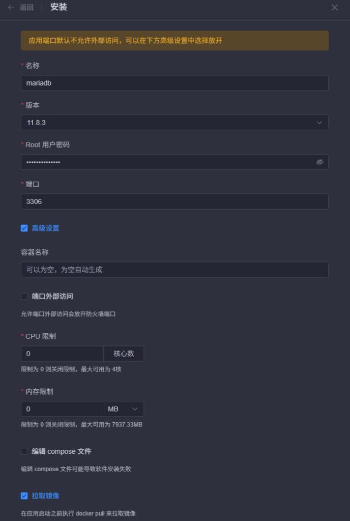 注意,需要记录下Root用户密码,也可以更改为自己的常用密码!以及绝对不能勾选端口外部访问,这将会导致数据库暴露在公网上引发安全问题!