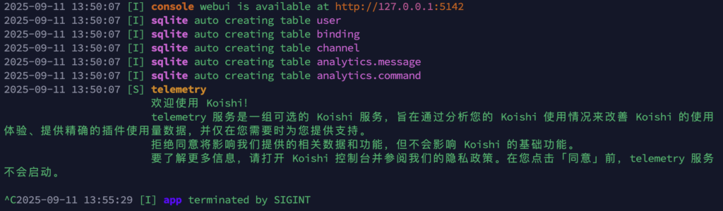 到这里为止,我们已经完全将开发环境搭建完毕了!下一节中会讲解Koishi各个界面的用处,创建第一个插件,以及编程的基础知识,再会!