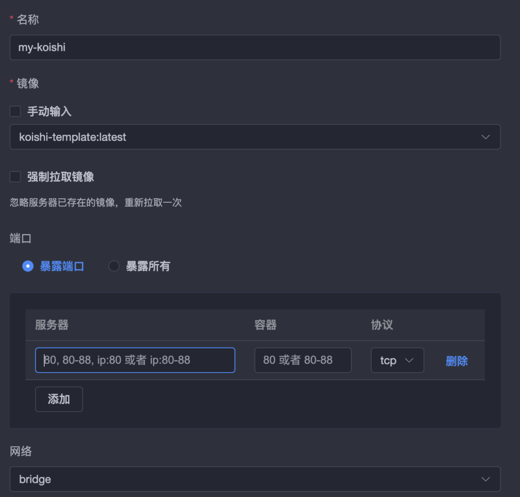 名称按自己喜好填写,镜像下拉栏中选择koishi-template:latest,然后选择暴露端口,以及保持网络选择bridge
