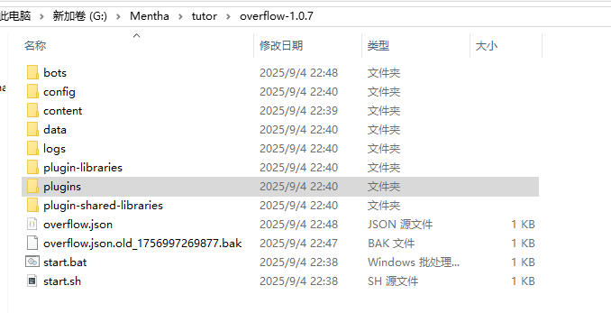 在服务器内找到我们安装mirai——也就是安装overflow的地方(如果你的mirai现在还在运行请Ctrl+C关闭),找到mirai目录下一个叫plugins的文件夹,将下载的MiraiNative文件放到这个文件夹里即可