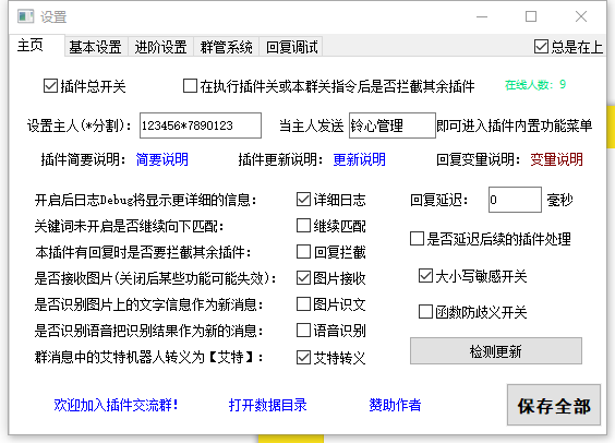 在面板主页,我们首先将“设置主人”输入框内输入自己(开发者)的qq号,并右下角点击保存全部来绑定