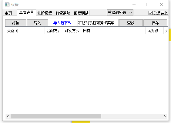 此时还没有任何的回复关键词,我们在空白处右键,点击添加,即可进入添加页面,我们来讲解一下各个输入框的作用