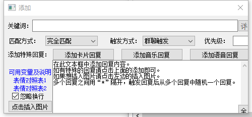 • 大文本框:如果匹配到关键词后,会回复的内容