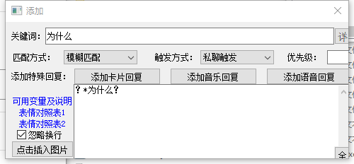 而如果想要让bot在我们的回复中包含“为什么”这三个字的时候回复“?”或者“为什么?”的时候可以这样写↓