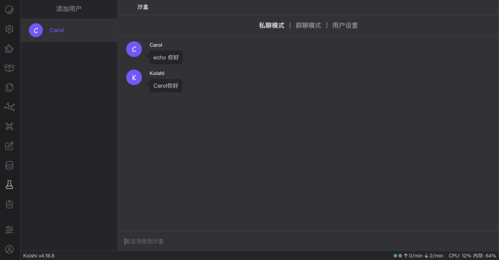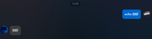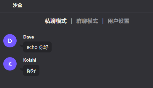 在我们没有在Koishi中接入Onebot和QQ时,我们可以通过沙盒对机器人进行测试(临时写的示例插件,内置其实并没有这个echo指令):