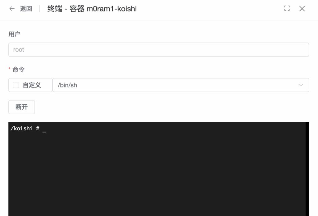 接下来会教学基础的插件开发!我们首先进入1Panel的容器界面,点击Koishi容器右侧的终端按钮: