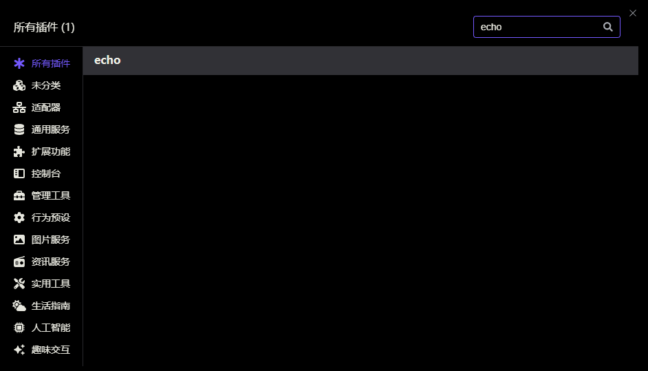 进入Koishi控制台,点击左边的插件配置,点击分组:develop,然后点击右上角的添加插件,搜索echo,然后点击出现的插件