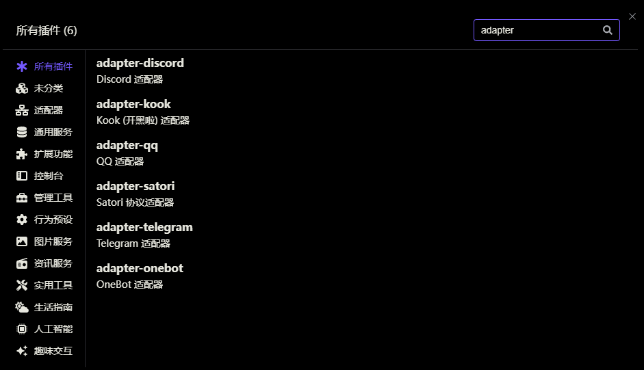 进入Koishi控制台,进入插件市场,搜索adapter-onebot并安装,到插件配置处添加插件: