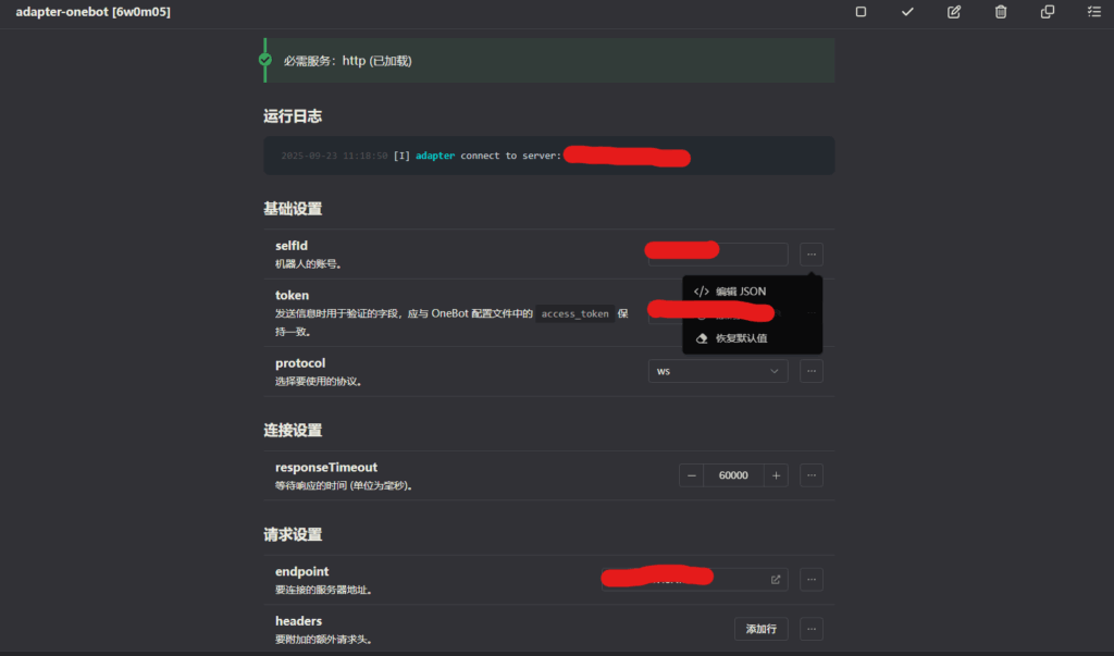 selfId填写机器人QQ号,token填写刚才在创建Websocket服务器的时候填写的密码,protocol选择ws,endpoint填写方法如下:去1Panel中找到napcat容器,上面会有IP地址