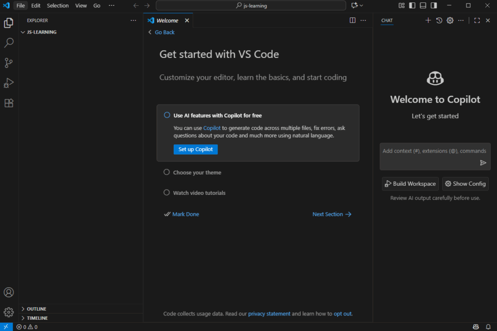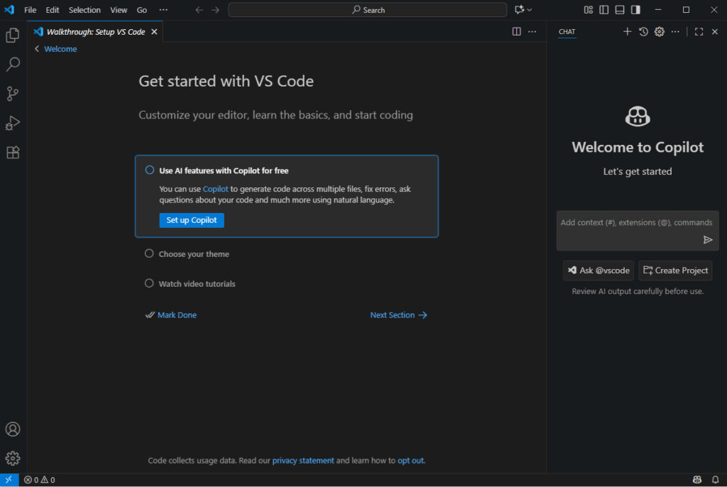 上图为我们开发时界面。左侧是资源管理器,用来查看我们存放代码和运行时环境的文件夹,中间是我们写代码的地方,右侧是Copilot,一个专门为编程服务的AI助手。如果需要使用Copilot可以根据上图Welcome页的指引,或者寻求群友或管理的帮助。