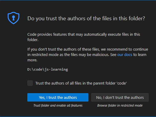 我们打开VS Code(下简称vsc)后会出现如上界面。我们直接点击File->Open Folder,在弹出的窗口中创建一个文件夹用来学习JS基础。