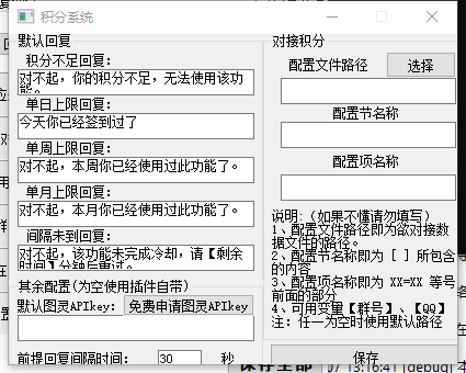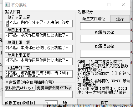 • 第二、第三个参数分别为[配置节]和[配置项],同【读配置】,不过由于这里我们控制的是积分的加减而非次数的加减,需要把配置节改为point(积分),配置项仍然是qq号