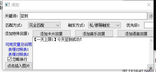 这个单日上限回复是通用的,也就是说,如果我们在一个非签到的部分中也使用了【一天上限】这个变量的话,bot就会很奇怪地回复一个“今天你已经签到过了”,所以在使用时必须考虑好这个上限回复是否可以满足所有的场景需求——这就是自带变量的限制