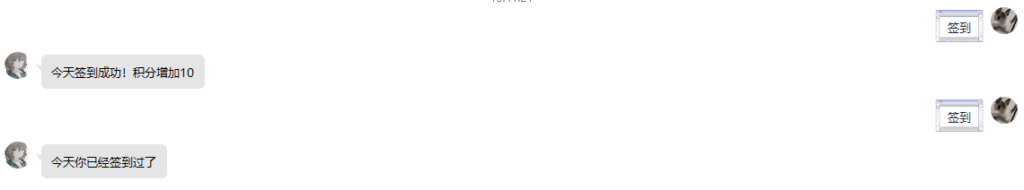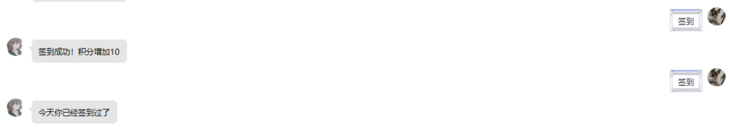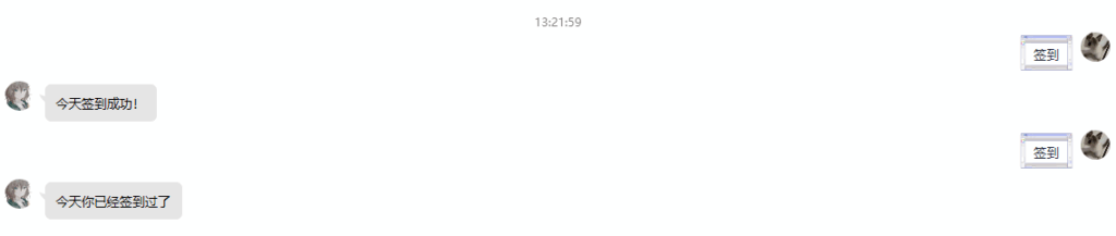• 用户会发送“签到”(或者别的表示签到的关键词)来签到,然后bot会发送一些表示签到成功的语句、并在后台为用户的某项数值做一些增加——比如虚拟货币、好感度、积分等等
