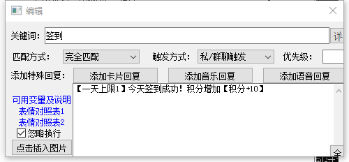 在知道了有【积分】变量后,我们来修改签到的回复