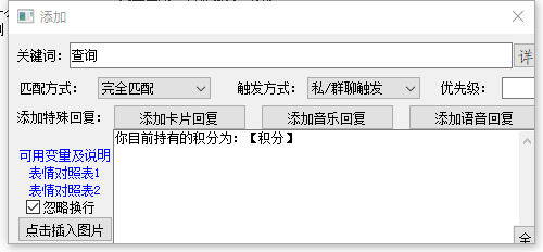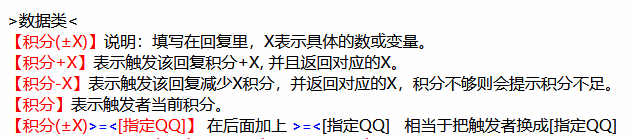 可以看到,我们并没有在回复中直接写明10这个数字,而是在变量的参数中写明了+10,这是由于积分的说明中写道,这个【积分+X】变量会返回对应的X——也就是说,在执行积分+10的操作后,这个变量在回复的显示上,会被替换为10这个数字