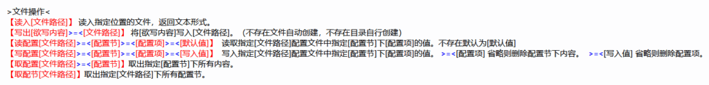 这时我们再来一个个看这些参数,首先是[被比较文本:今天触发的次数],在上文中我们说到,应该从文件里读取这个数值,而要实现文件读写,我们可以在变量说明中找到文件操作这一栏,它包含: