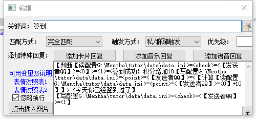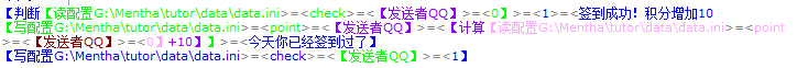 【判断【读配置G:Menthatutordatadata.ini>=<check>=<【发送者QQ】>=<0】>=<1>=<签到成功!积分增加10【写配置G:Menthatutordatadata.ini>=<point>=<【发送者QQ】>=<【计算【读配置G:Menthatutordatadata.ini>=<point>=<【发送者QQ】>=<0】+10】】>=<今天你已经签到过了】