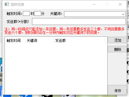 接下来进入定时任务设置,我们将触发时间设置为0时1分,关键词就是“清空签到次数”,群号可以随便填写比如123456789之类的,不出意外的话到了第二天凌晨就会清空所有签到次数
