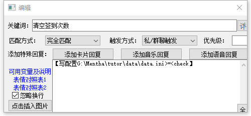 对于[相同返回文本:另一些文字],我们不需要变量,直接写上自己想要的回复即可