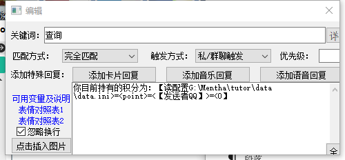 • 前半段没有任何括号的部分,bot会原样发送出去,作为bot的回复。由于后面的【写配置】不像【积分】变量不具有返回值,所以这里我们必须自己写积分会增加10这个数字