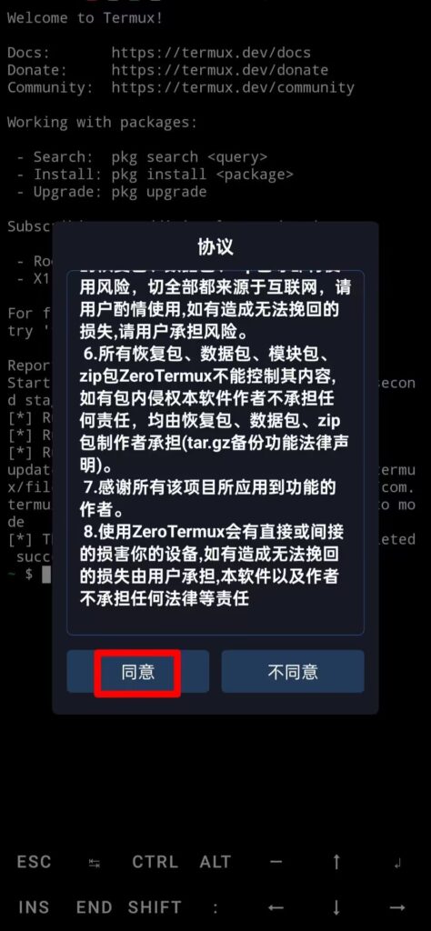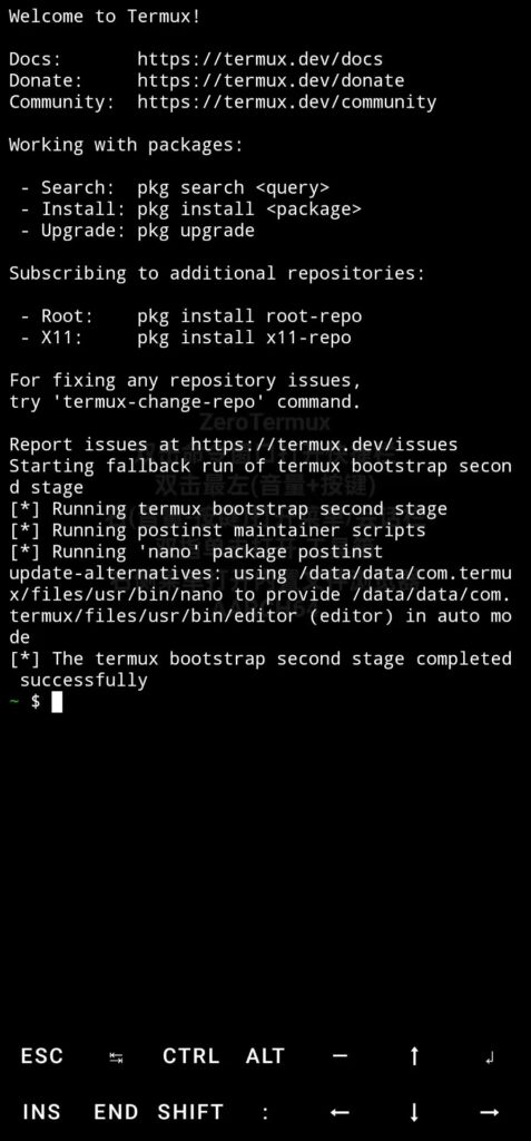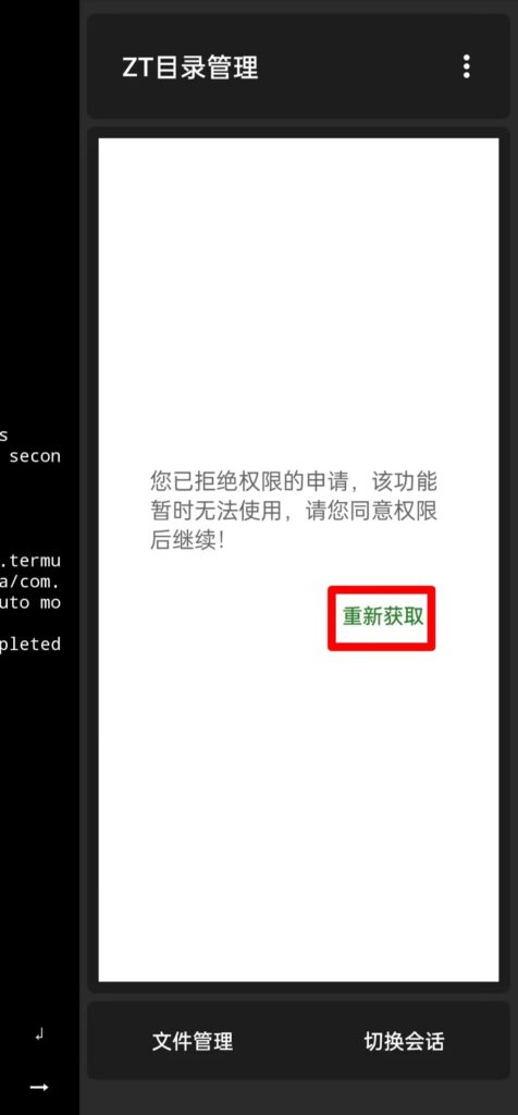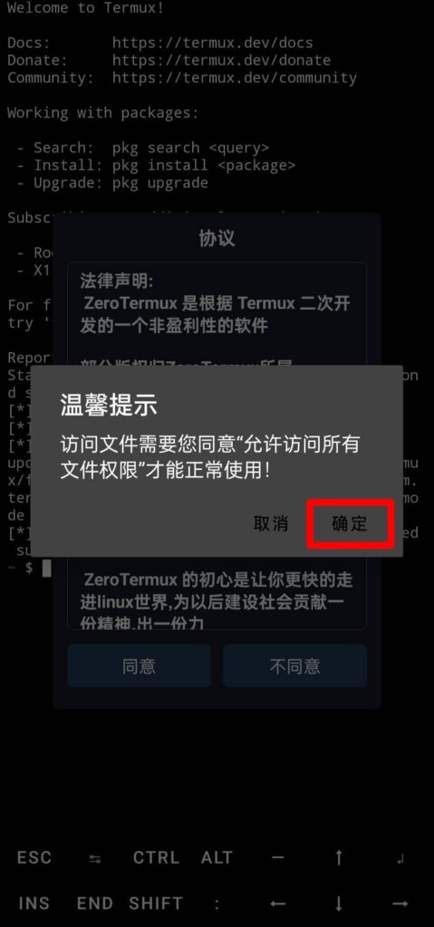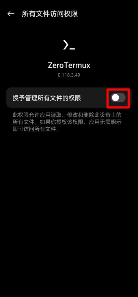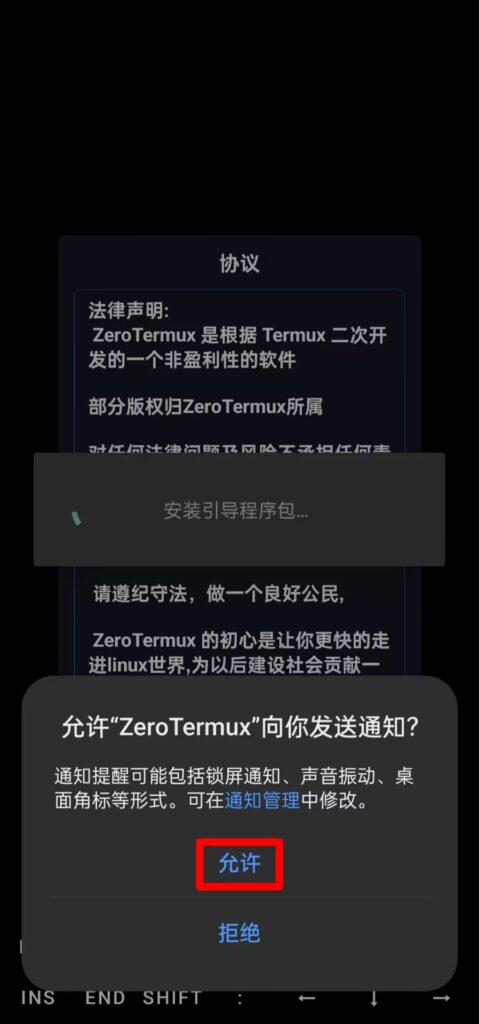 点击下载ZeroTermux,安装并进入应用,首先授予它所有的权限,按照指引授权即可。
