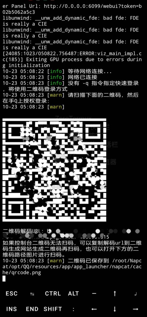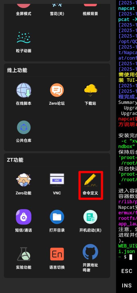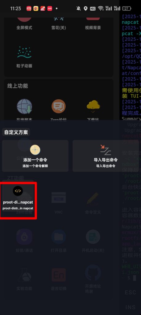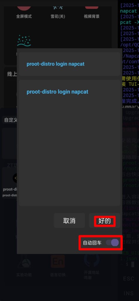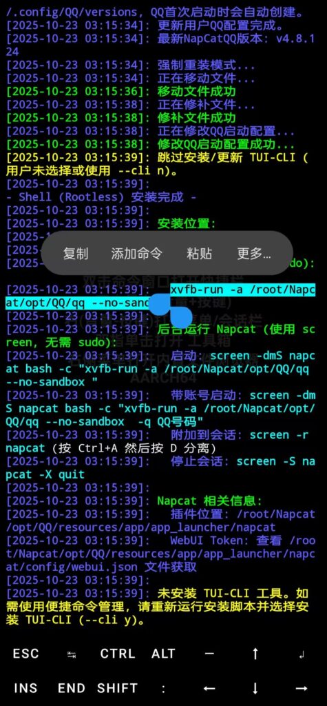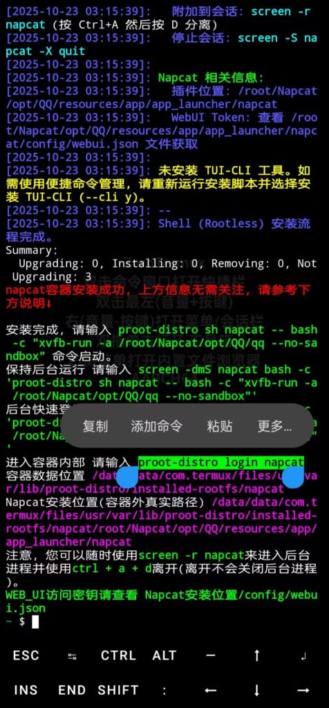 随后按下音量键,点击切换会话,新回话,点击[2]。此时我们创建了一个新的会话,也就是把Napcat的进程放到后台了。在新的会话中,使用进入容器指令,并且输入下面指令回车: