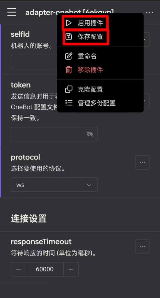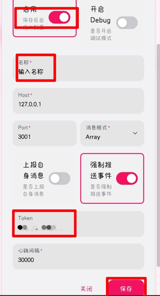 点击启用,随意填写名称,记录Token(这个称为Onebot Token),点击保存: