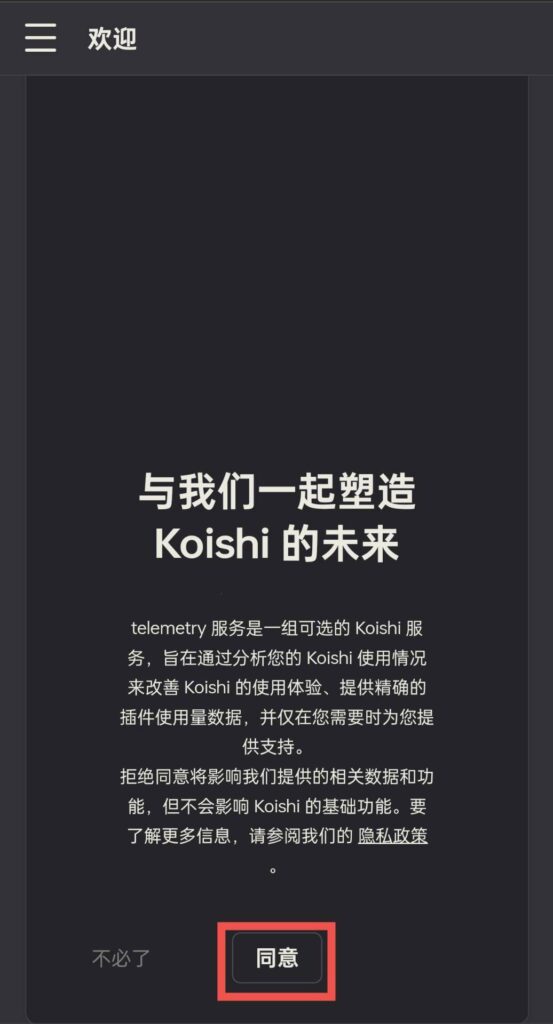 要了解更多信息,请打开 Koishi 控制台并参阅我们的隐私政策。在您点击「同意」前,telemetry 服务不会启动